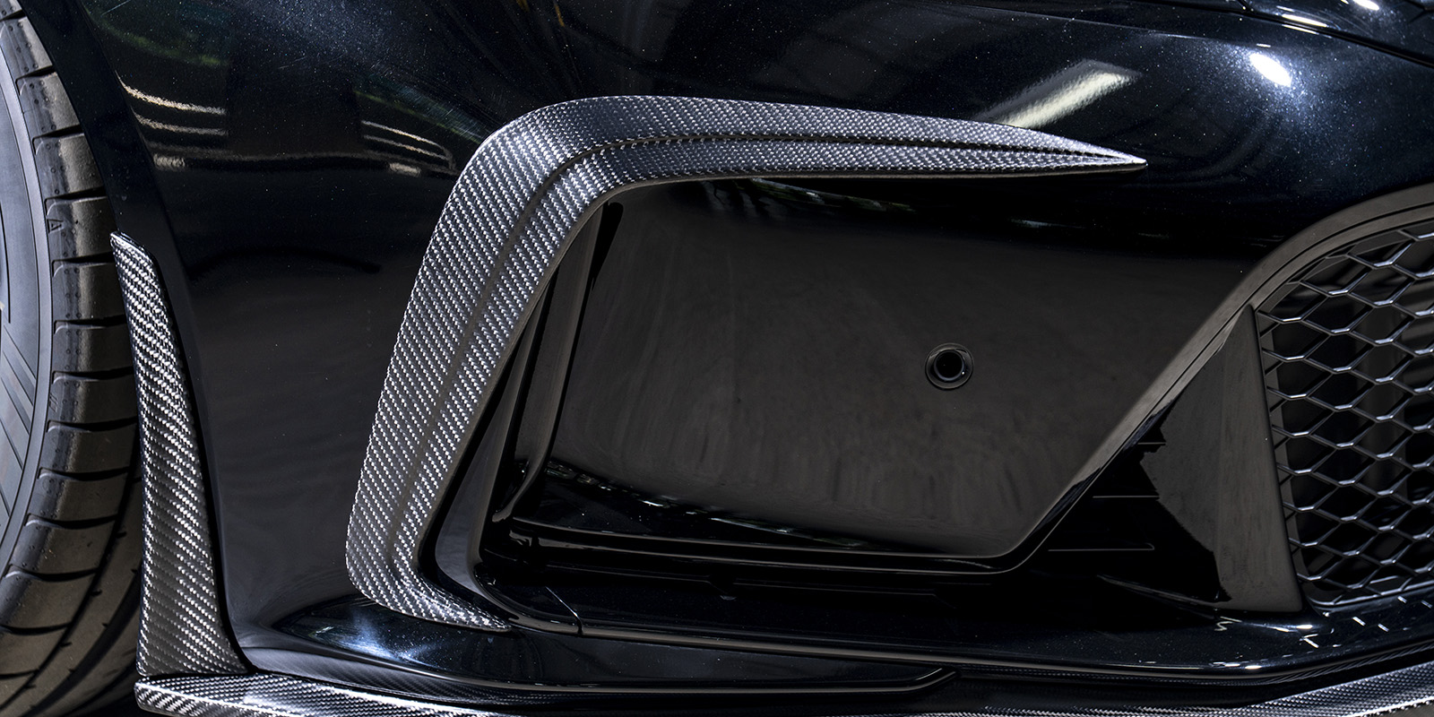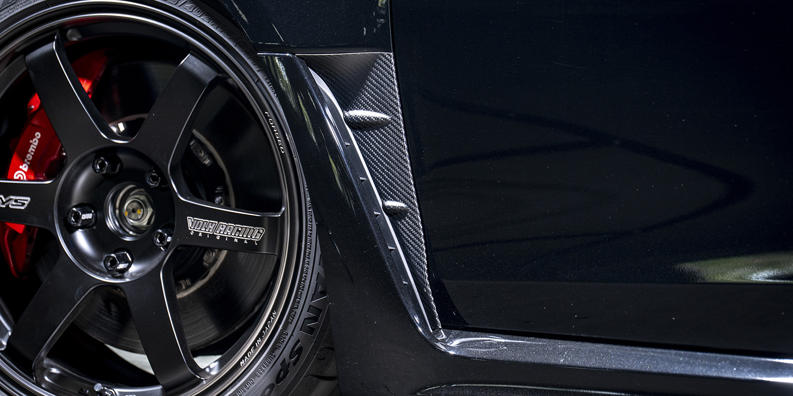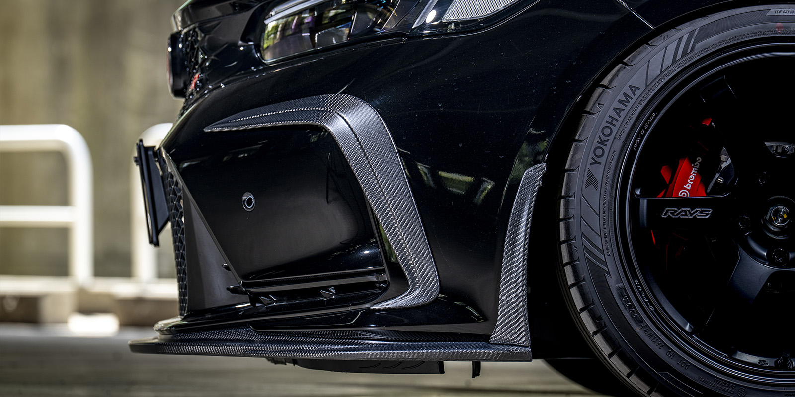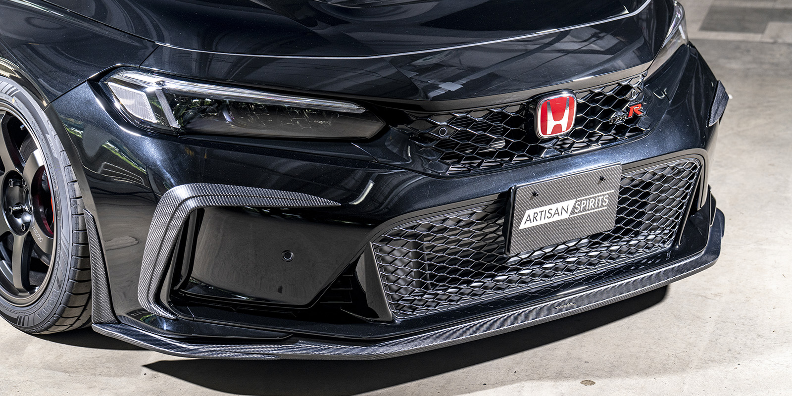 純正のラインに沿いながら中央から左右まで伸びるシャープな造形がフロントフェイスに陰影を与え精悍さを引き出します