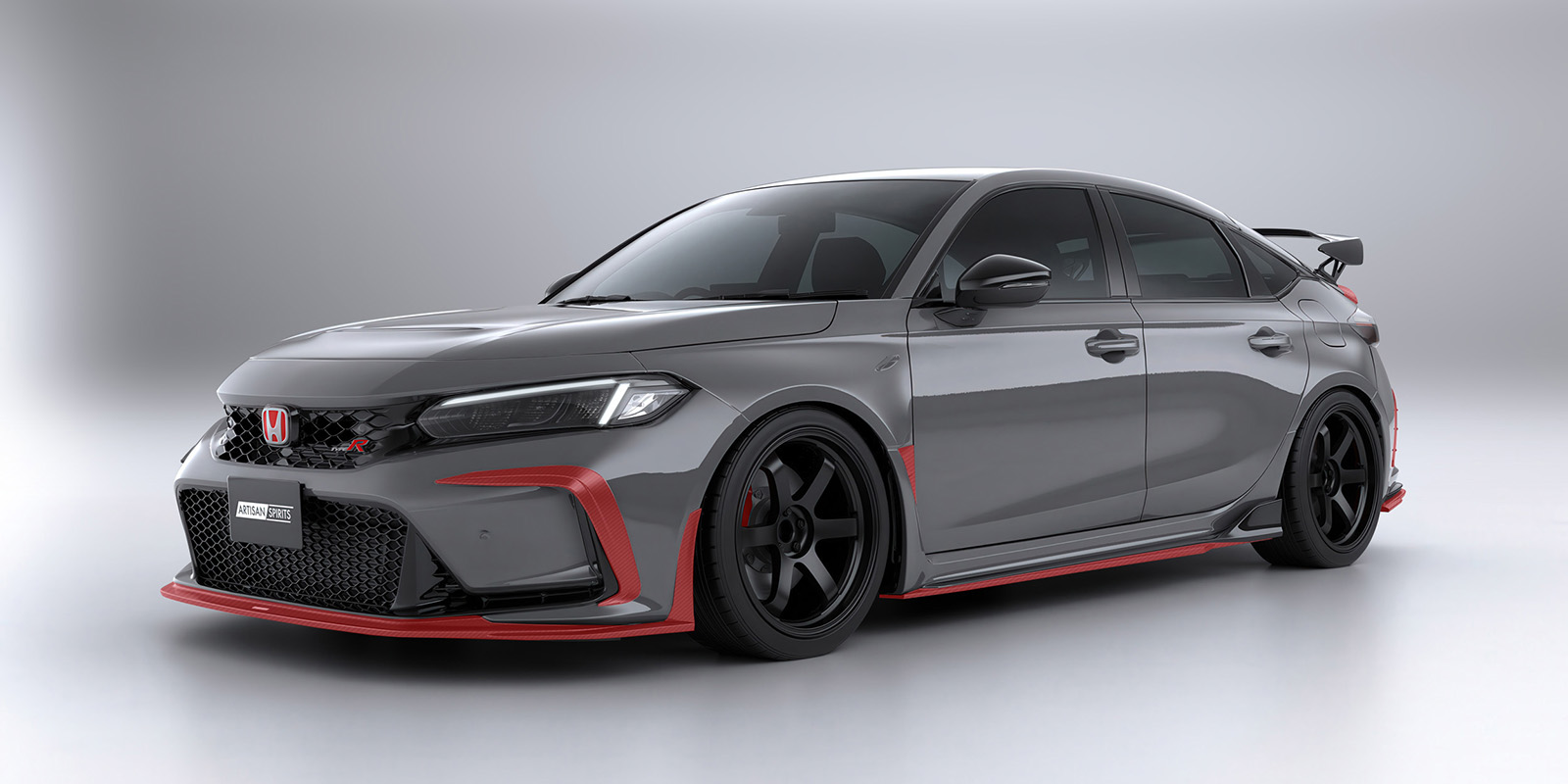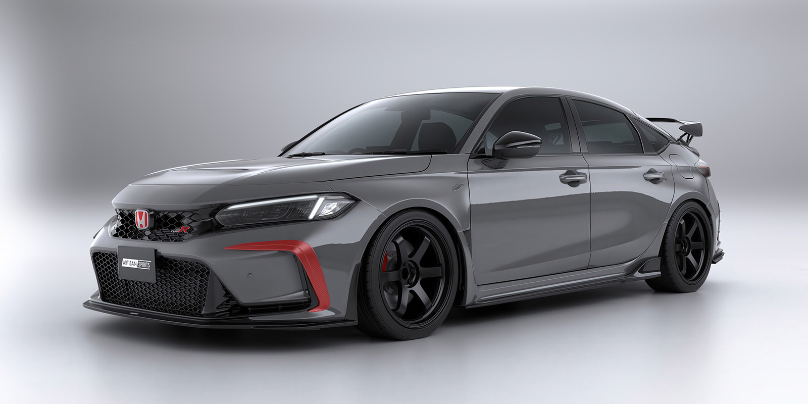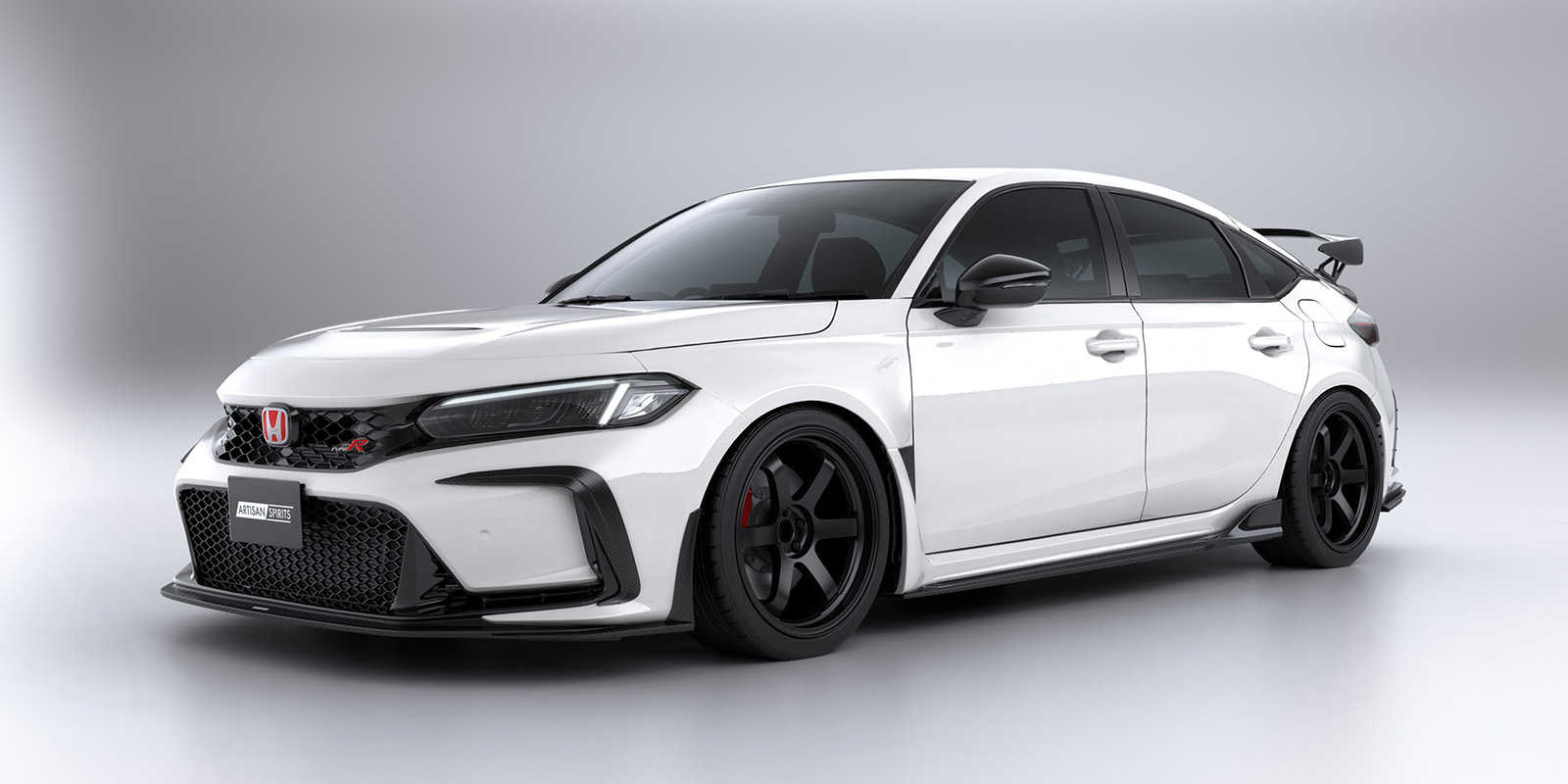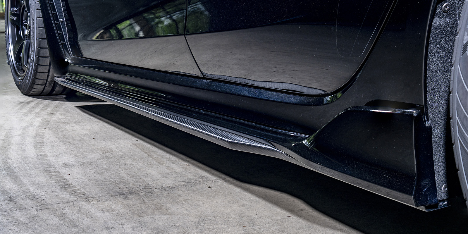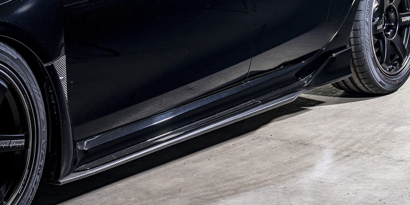純正のラインに沿いながら中央から左右まで伸びるシャープな造形がフロントフェイスに陰影を与え精悍さを引き出します